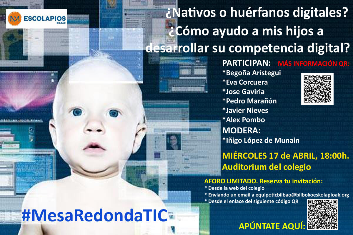 Animamos a acudir, hasta llenar el aforo, a la #MesaRedondaTIC de la que hemos tenido noticia vía Iñigo López de Munain, @inigoldem, Maestro de Educación Especial y Licenciado en Psicopedagogía, y Coordinador del Equipo TIC de Escolapios de Bilbao, que moderará la Mesa. Se celebrará el miércoles 17 de ABRIL de 2013 a las 18:00 en el Auditorium del colegio Calasancio de Bilbao. Reserva de invitaciones en la siguiente web.